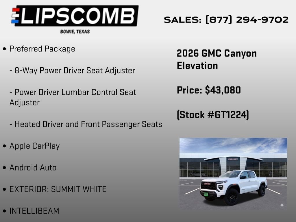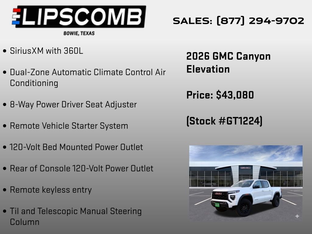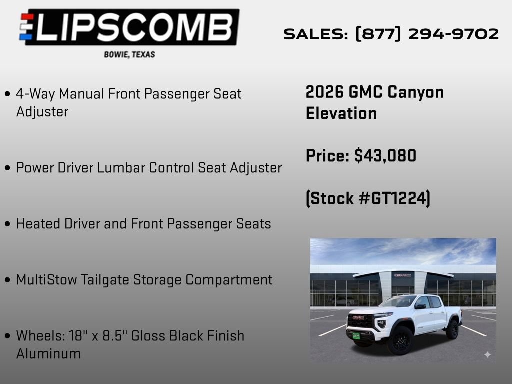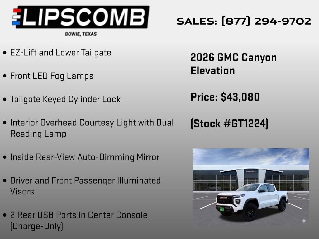 Elevate your driving experience with the 2026 GMC Canyon Elevation. This exceptional mid-size pickup combines powerful performance, exceptional utility, and a wealth of premium features to create a vehicle that is truly in a class of its own. We invite you to visit our showroom and experience the Canyon Elevation for yourself. Let us demonstrate how this remarkable truck can transform the way you work, play, and explore the world around you.