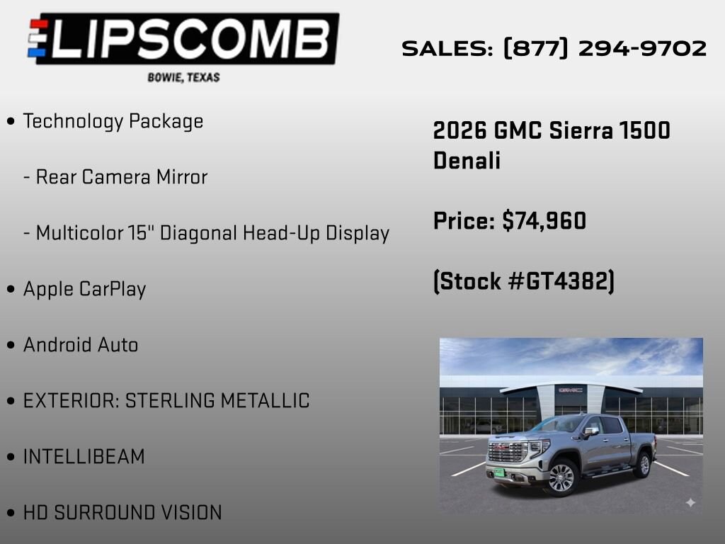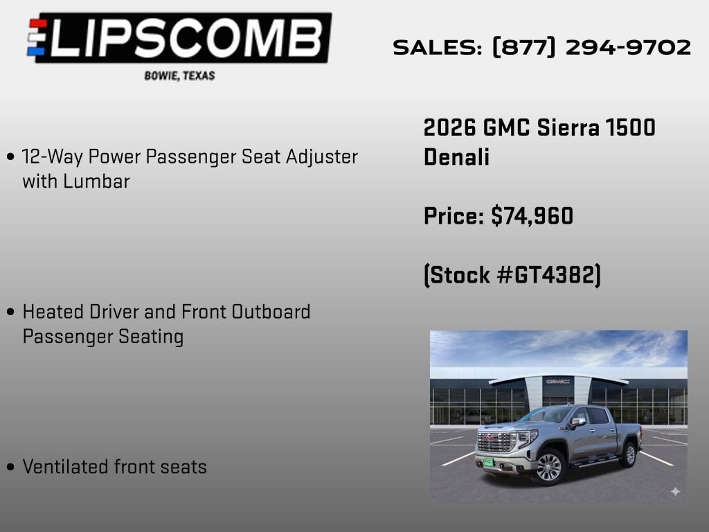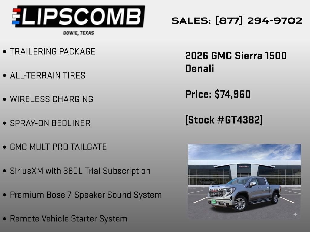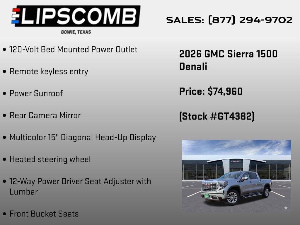 Elevate your driving experience with the 2026 GMC Sierra 1500 Denali. This exceptional full-size pickup offers uncompromising power, cutting-edge technology, and unparalleled luxury. Visit our showroom today to explore this remarkable vehicle and discover how it can transform your driving life.
