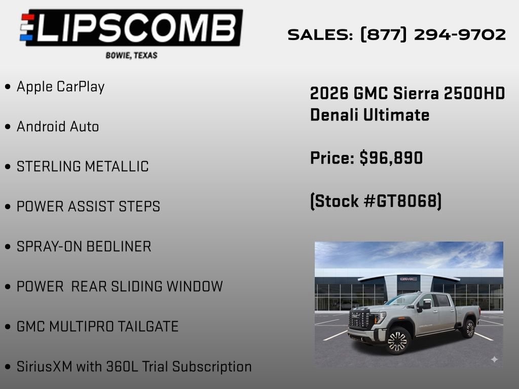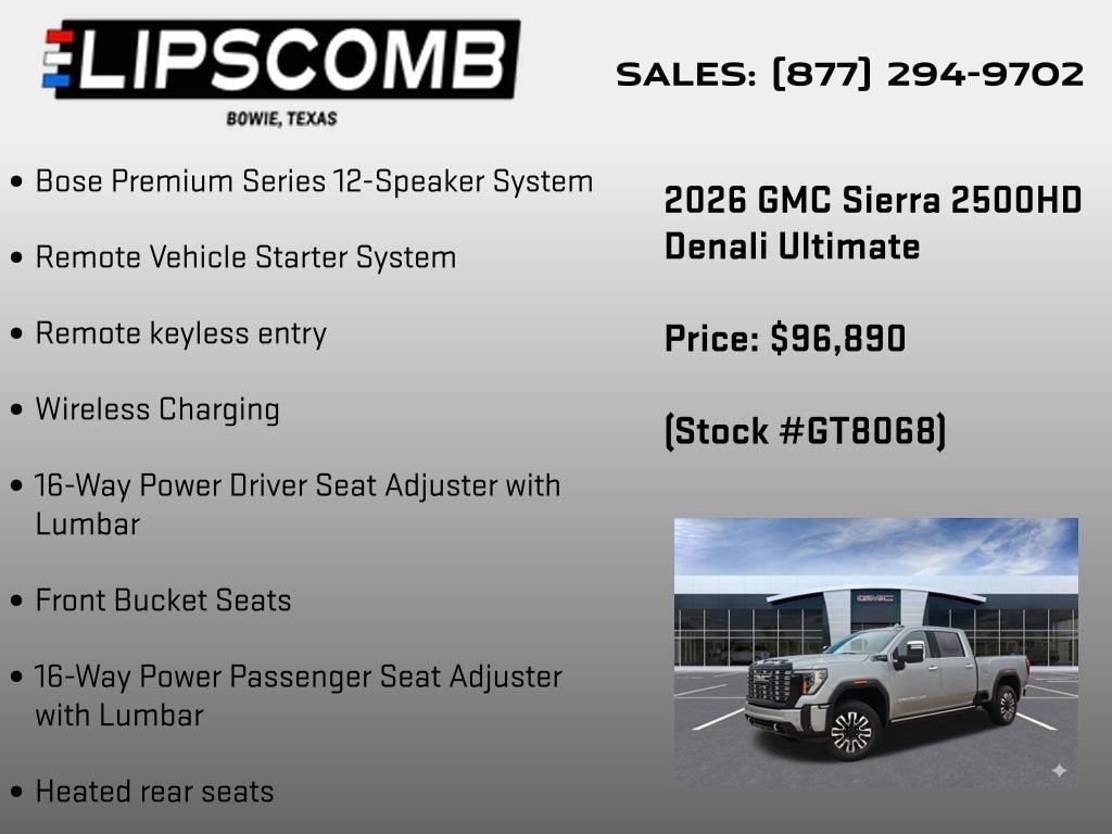 This 2026 GMC Sierra 2500HD Denali Ultimate is a true masterpiece of engineering and design. With its uncompromising capability, advanced technology, and refined luxury, it is the ultimate expression of what a premium heavy-duty truck should be. Experience the difference for yourself schedule a test drive today and discover the exceptional power and comfort that awaits you.