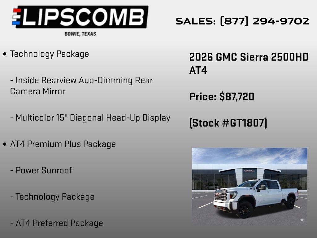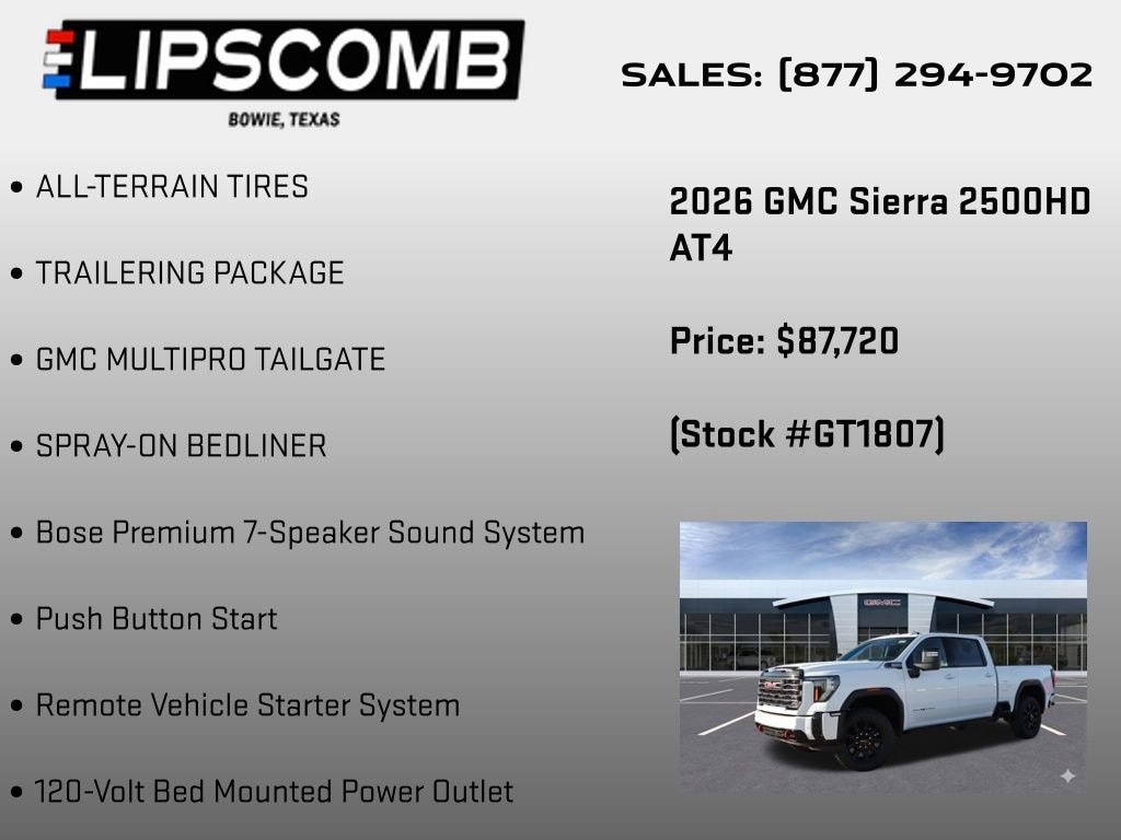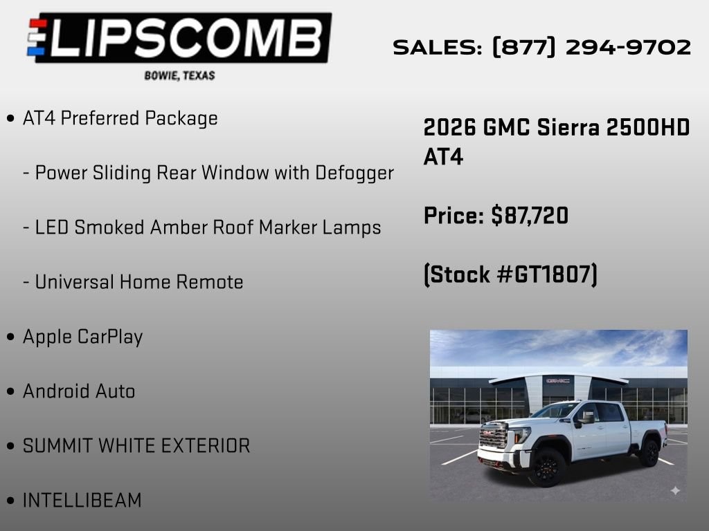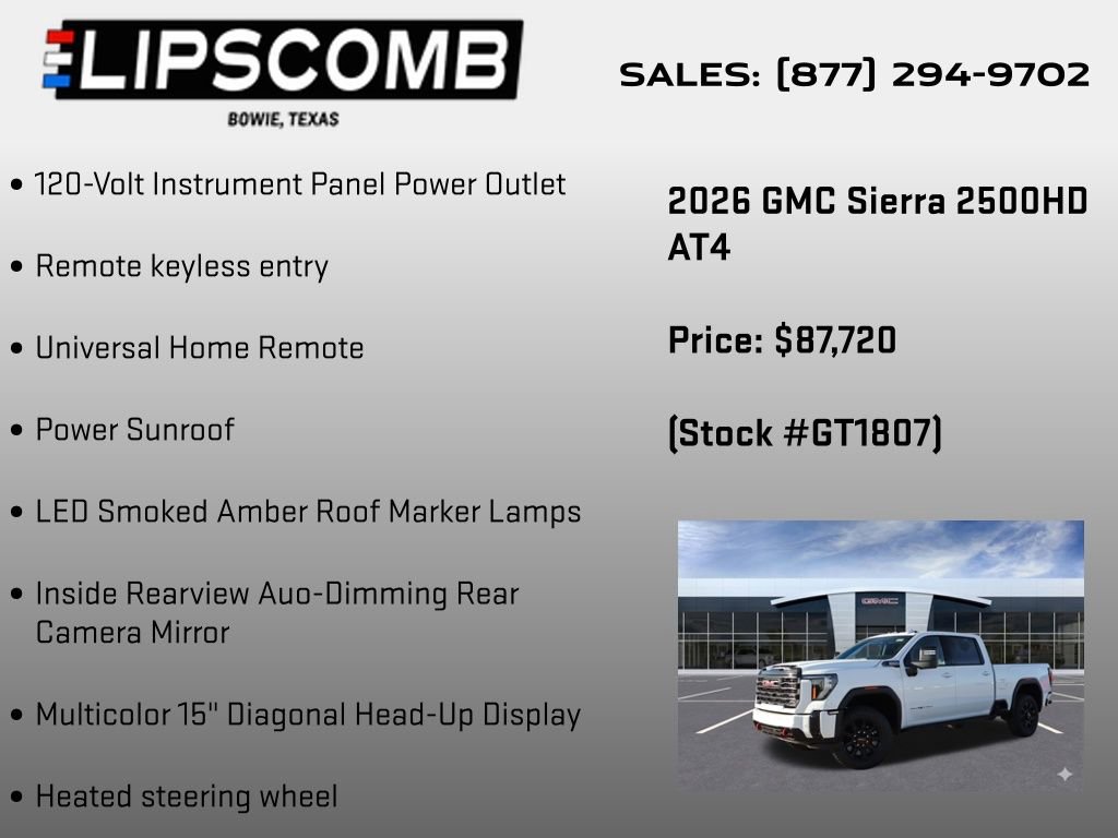 This exceptional 2026 GMC Sierra 2500HD AT4 is available now for $87,720. Experience the power, technology, and uncompromising style that this vehicle has to offer. Visit our showroom today and let us demonstrate how this Sierra 2500HD AT4 can elevate your driving experience.