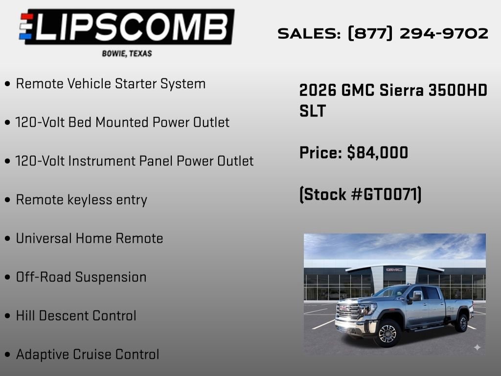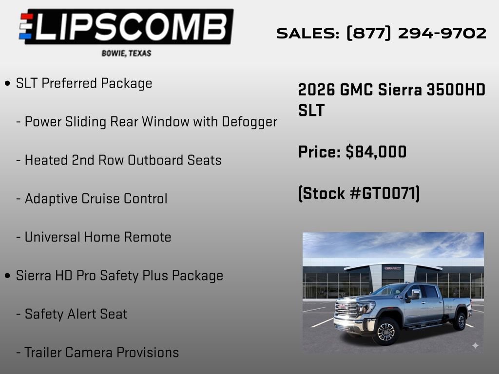 This exceptional vehicle is the perfect blend of power, technology, and luxury. Discover the unparalleled capabilities of the 2026 GMC Sierra 3500HD SLT and schedule a test drive today. We're confident you'll be impressed by its exceptional performance and refined features.
