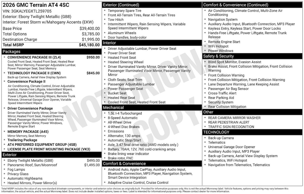 Powered by a 1.5L DOHC engine and equipped with an 8-Speed Automatic transmission with Overdrive and All-Wheel Drive, the 2026 Terrain AT4 delivers a dynamic and efficient performance that will have you eagerly anticipating every drive. With an EPA-estimated 24 city/26 highway MPG, this SUV balances power and efficiency to meet your diverse needs.