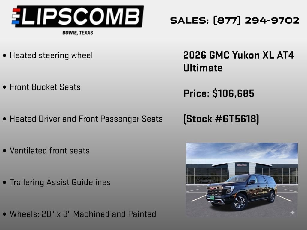 Experience the ultimate in luxury and capability with the 2026 GMC Yukon XL AT4 Ultimate. With its exceptional performance, advanced technology, and premium amenities, this SUV is the perfect companion for your next journey. Visit our showroom today and discover the power and refinement that only the Yukon XL AT4 Ultimate can deliver.